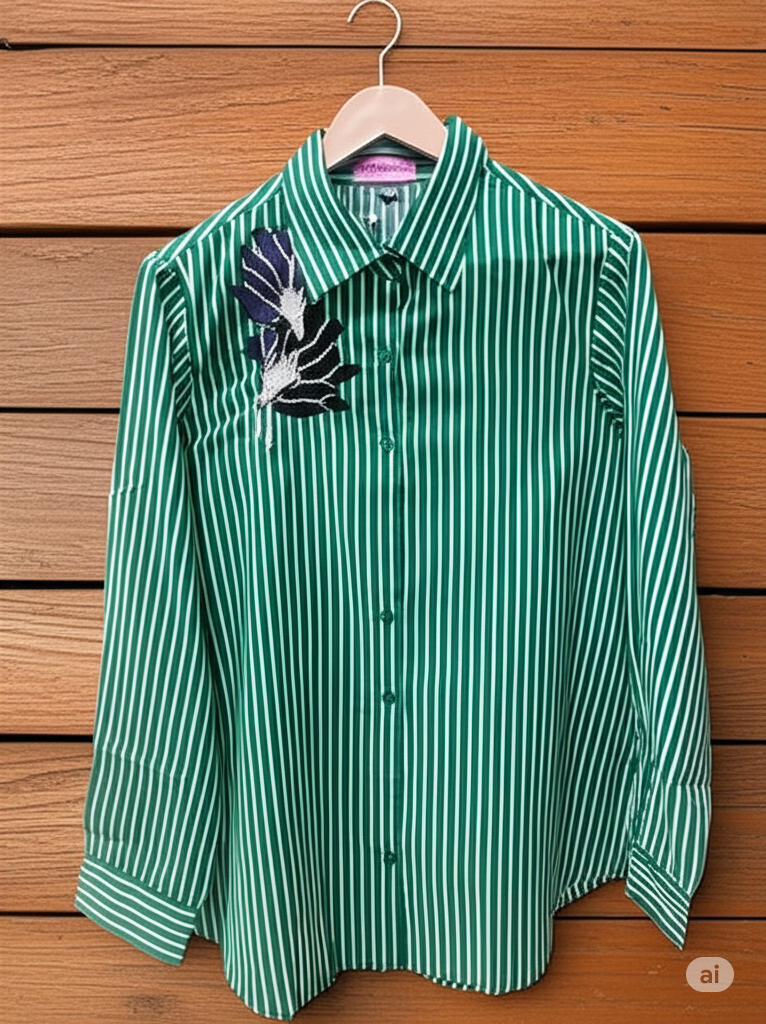 Make a statement in this vibrant emerald green and white pinstripe shirt. Adorned with a striking, embellished floral appliqué on the chest, this shirt combines classic stripes with a touch of glamorous artistry. Ideal for adding a pop of color and unique detail to your wardrobe.