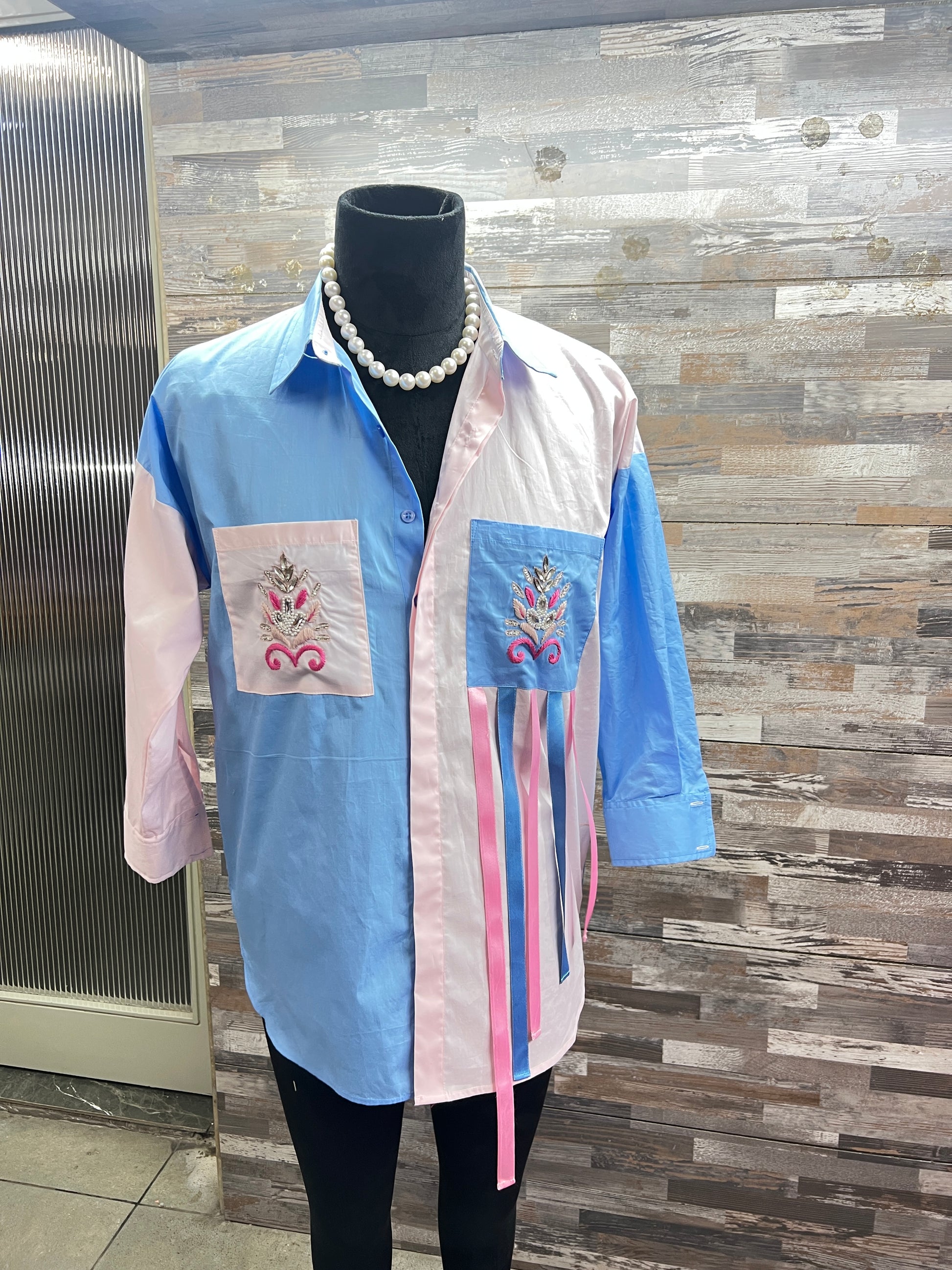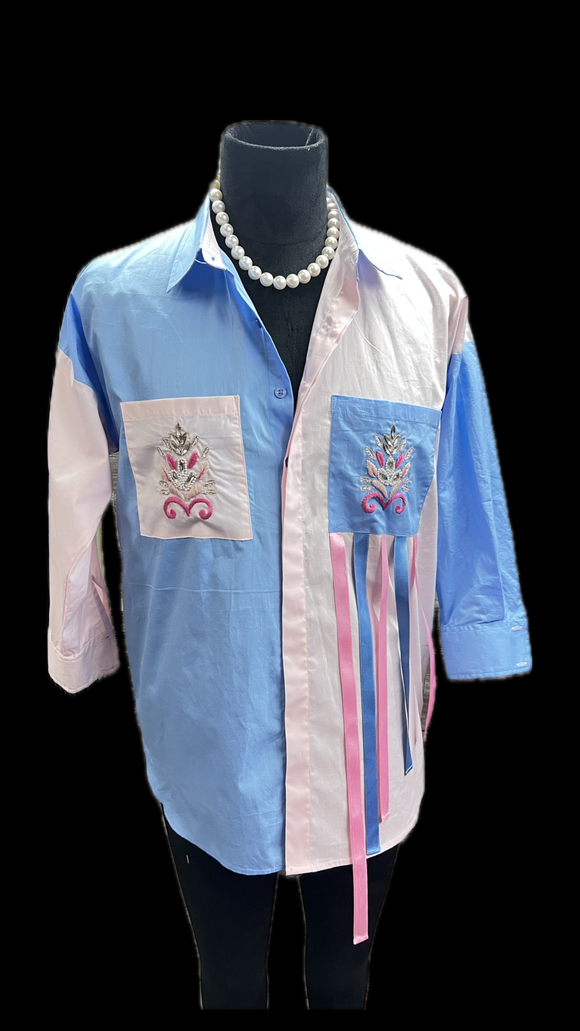 Make a statement with this The Colorblock Muse Shirt, a stunning fusion of bold design and feminine charm. Featuring a fresh blue and white colorblock pattern, this shirt stands out with hand-embroidered motifs on each front pocket and playful pink and blue ribbon fringes cascading from the center.