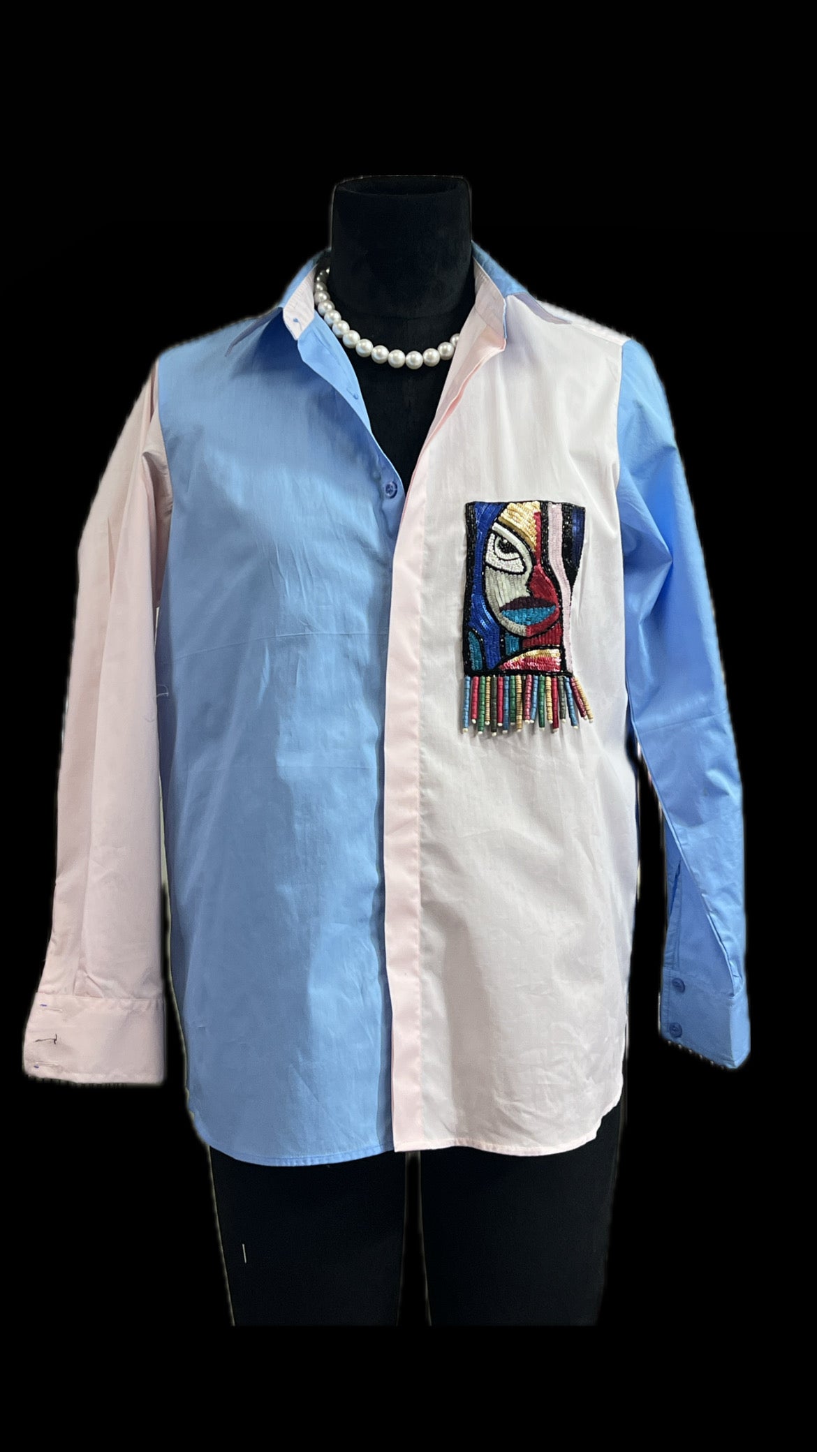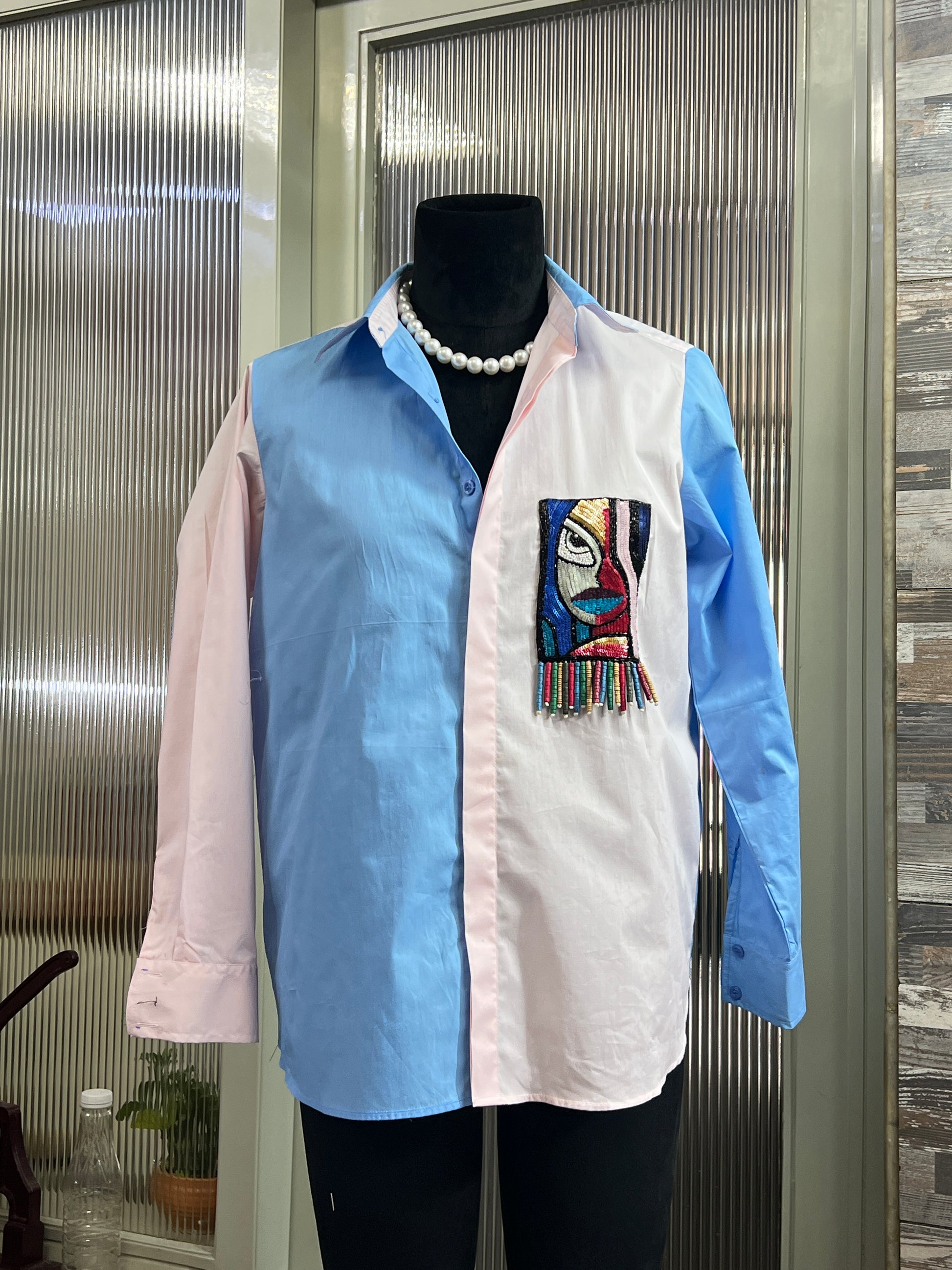 The standout feature is an abstract beaded face patch on the chest pocket, inspired by Picasso-style modern art. Enhanced with multicolored fringe details, this shirt effortlessly blends fashion with wearable art, making it perfect for casual outings, streetwear looks, or artistic events.