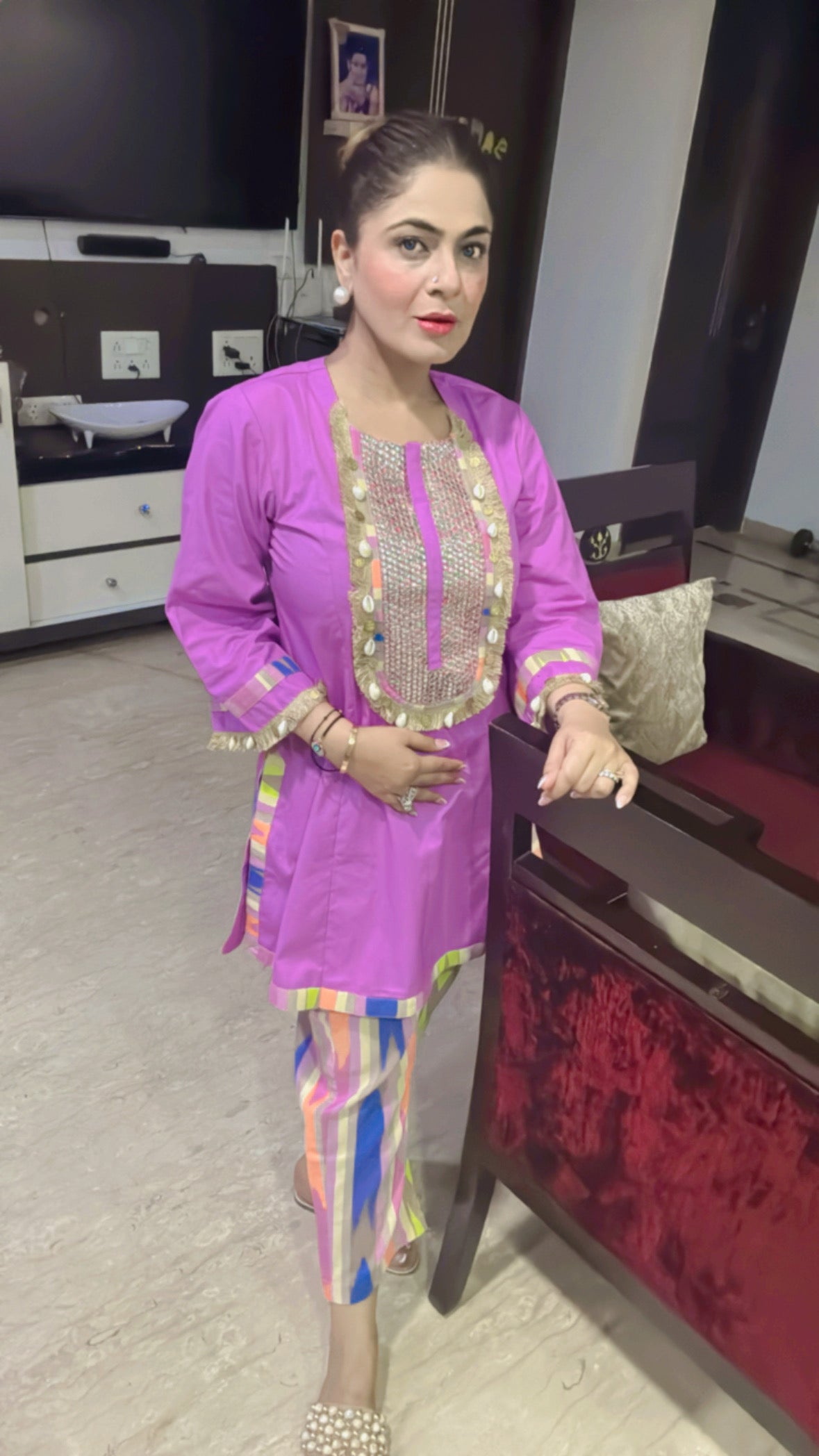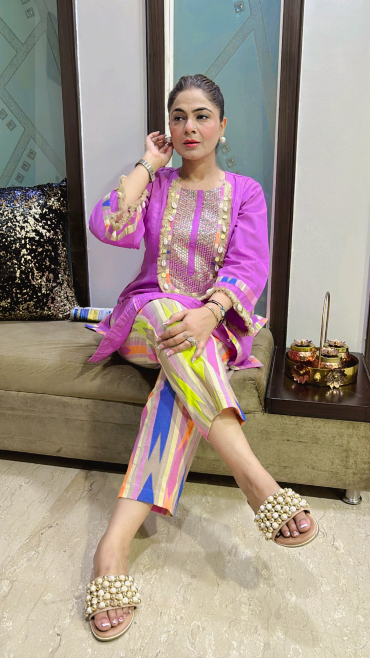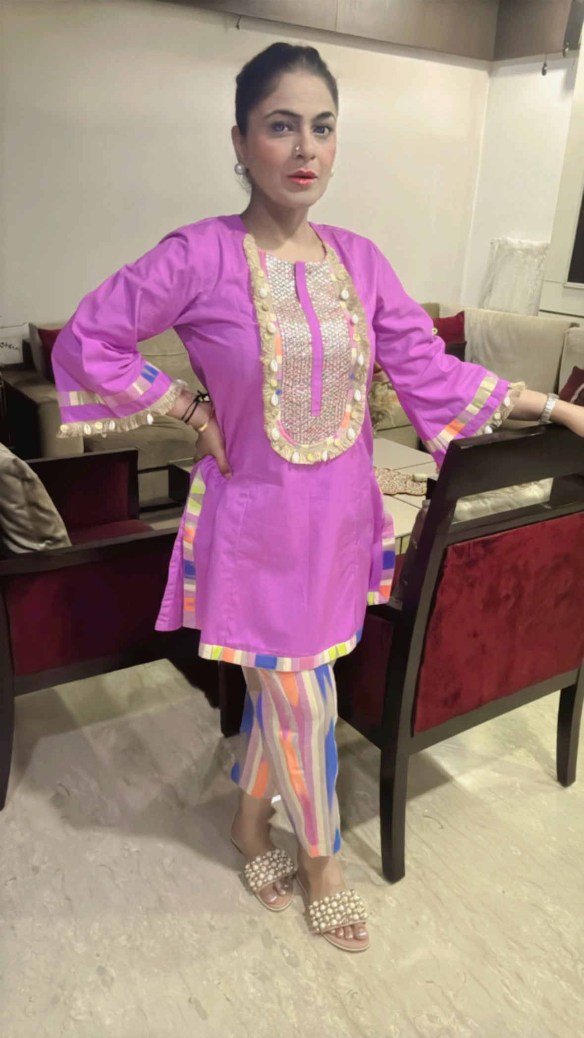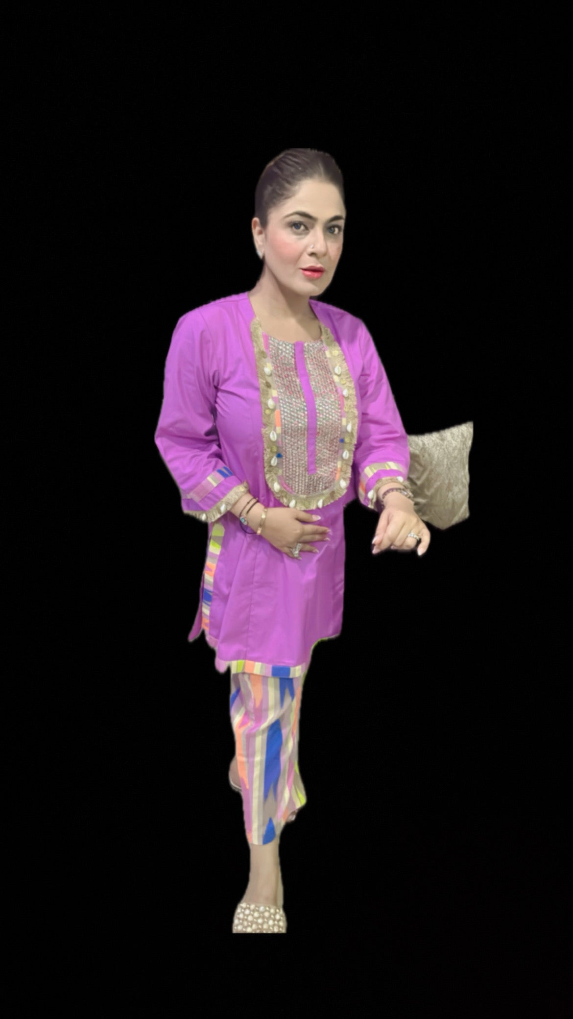 Brighten your day with the Noor-e-Gulbano Kurta Set — a radiant fusion of vibrant tradition and effortless grace. The deep pink kurta features hand-embellished mirror work, delicate bead details, and bold accents along the sleeves and neckline. Paired with playful multi-colored striped trousers, this set brings joy to everyday style.
