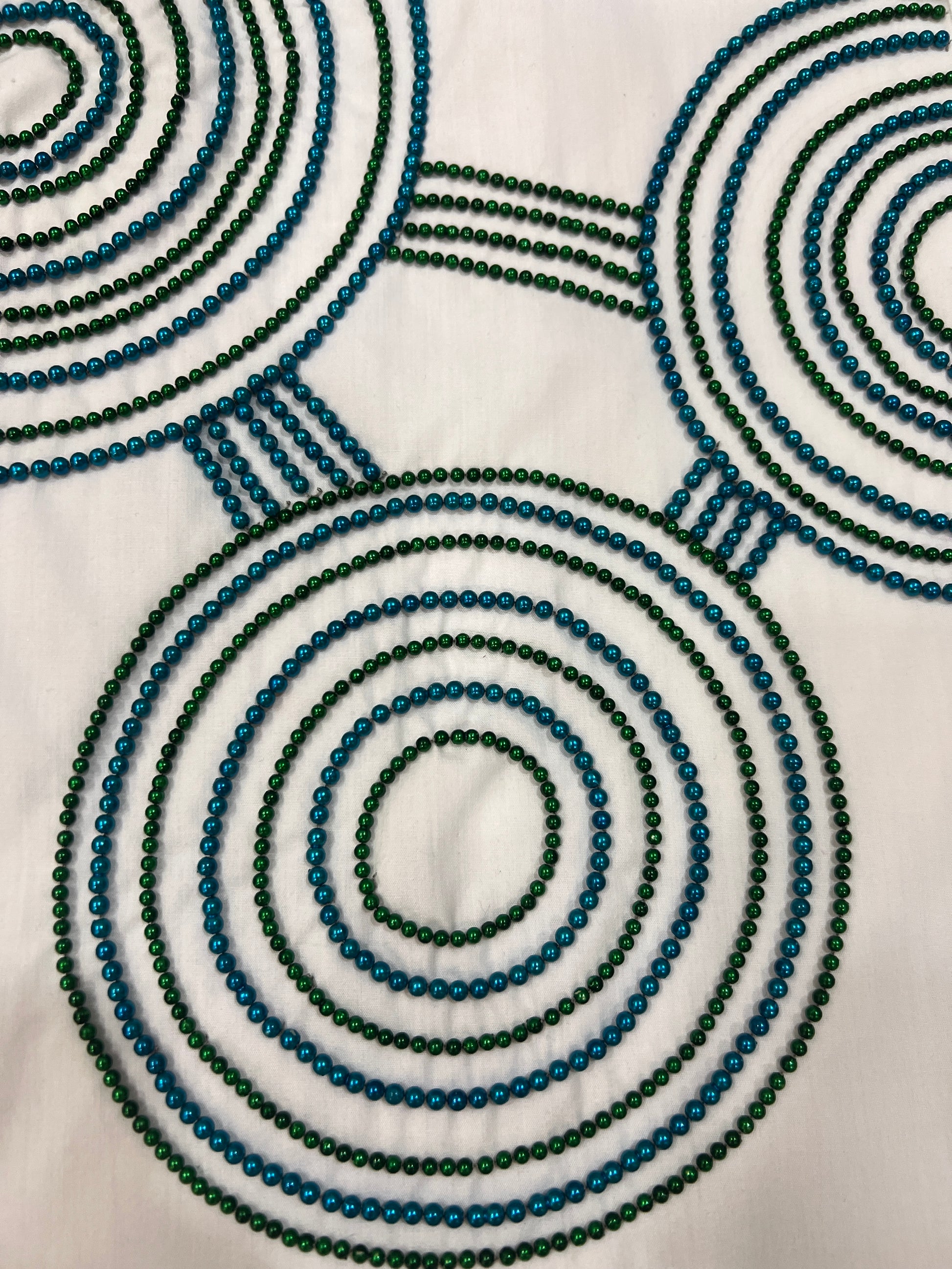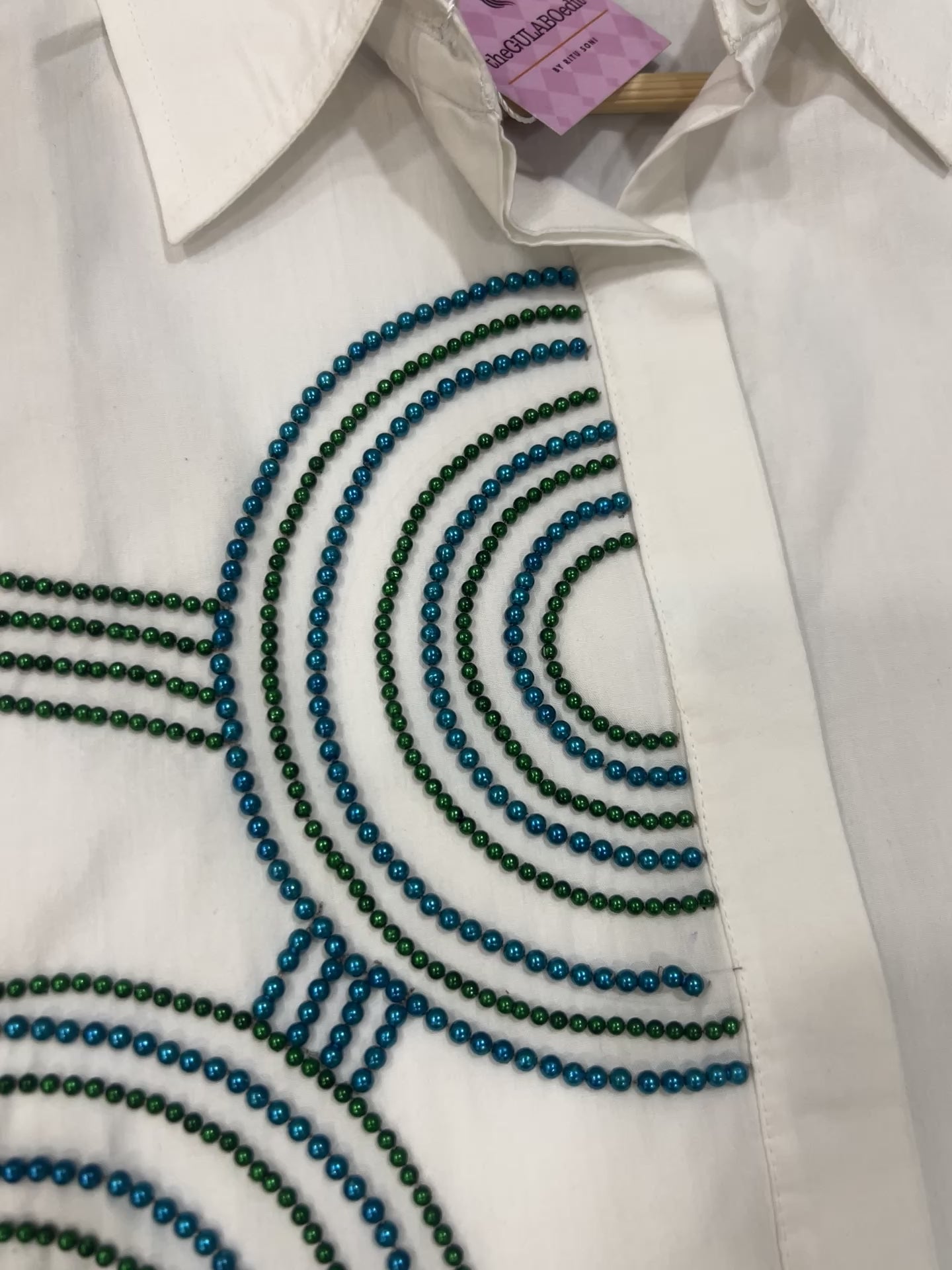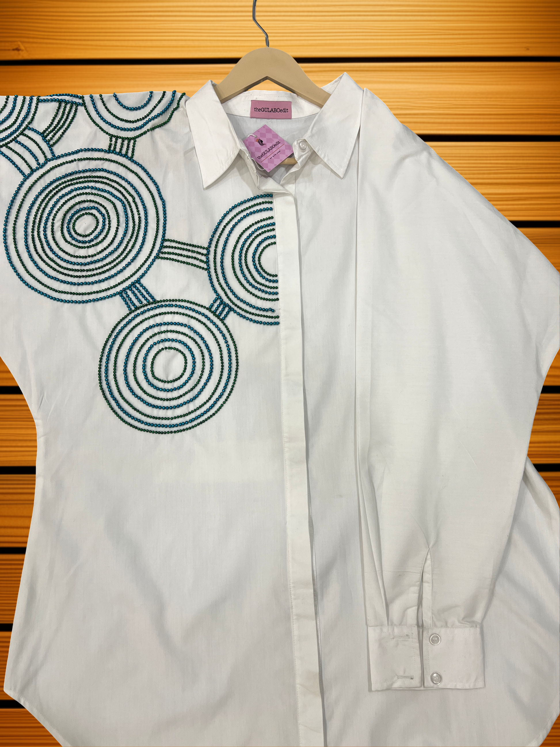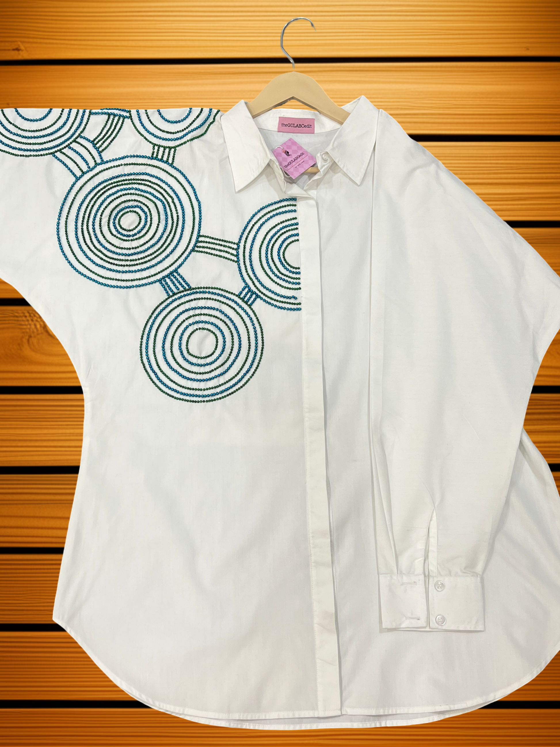 Discover modern elegance with our White Serene Circles Embroidered Dolman Shirt. This crisp white button-up features an eye-catching abstract embroidery design on the left side, composed of concentric circles in shades of teal and dark blue. The relaxed dolman sleeves and comfortable fit offer a contemporary silhouette, making this shirt a stylish and unique addition to your everyday or smart-casual wardrobe.